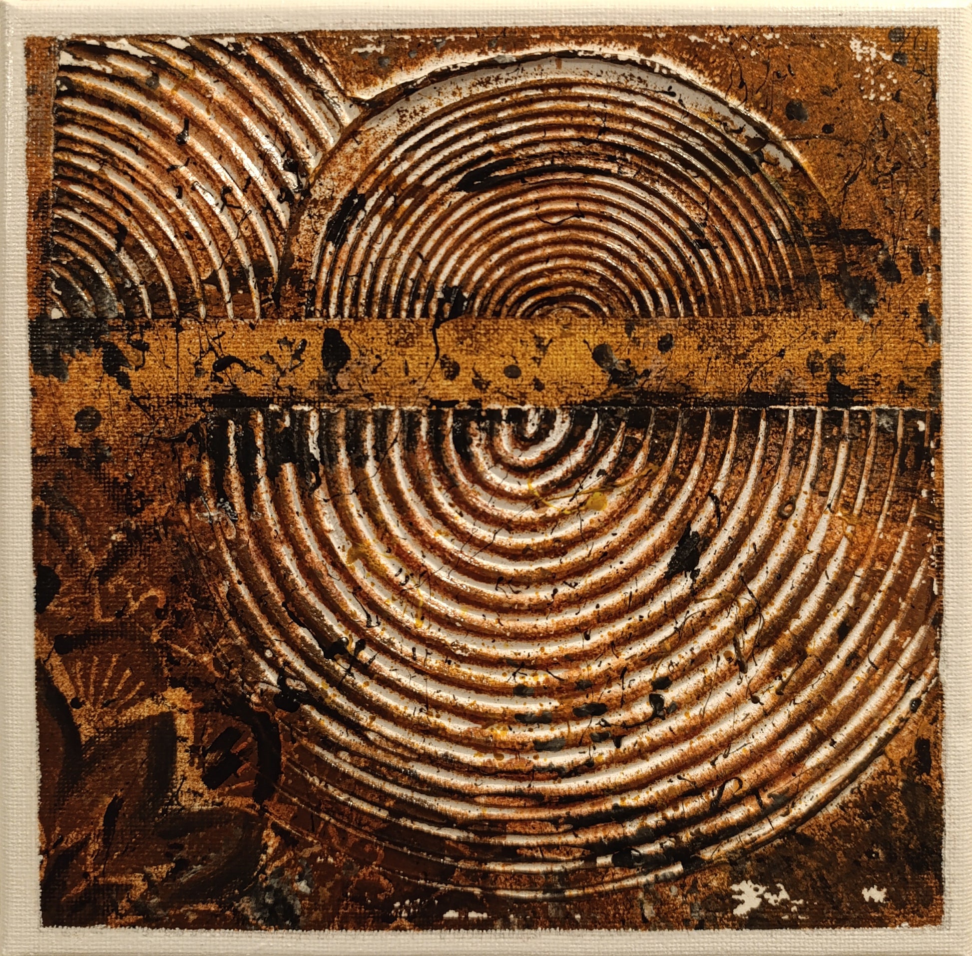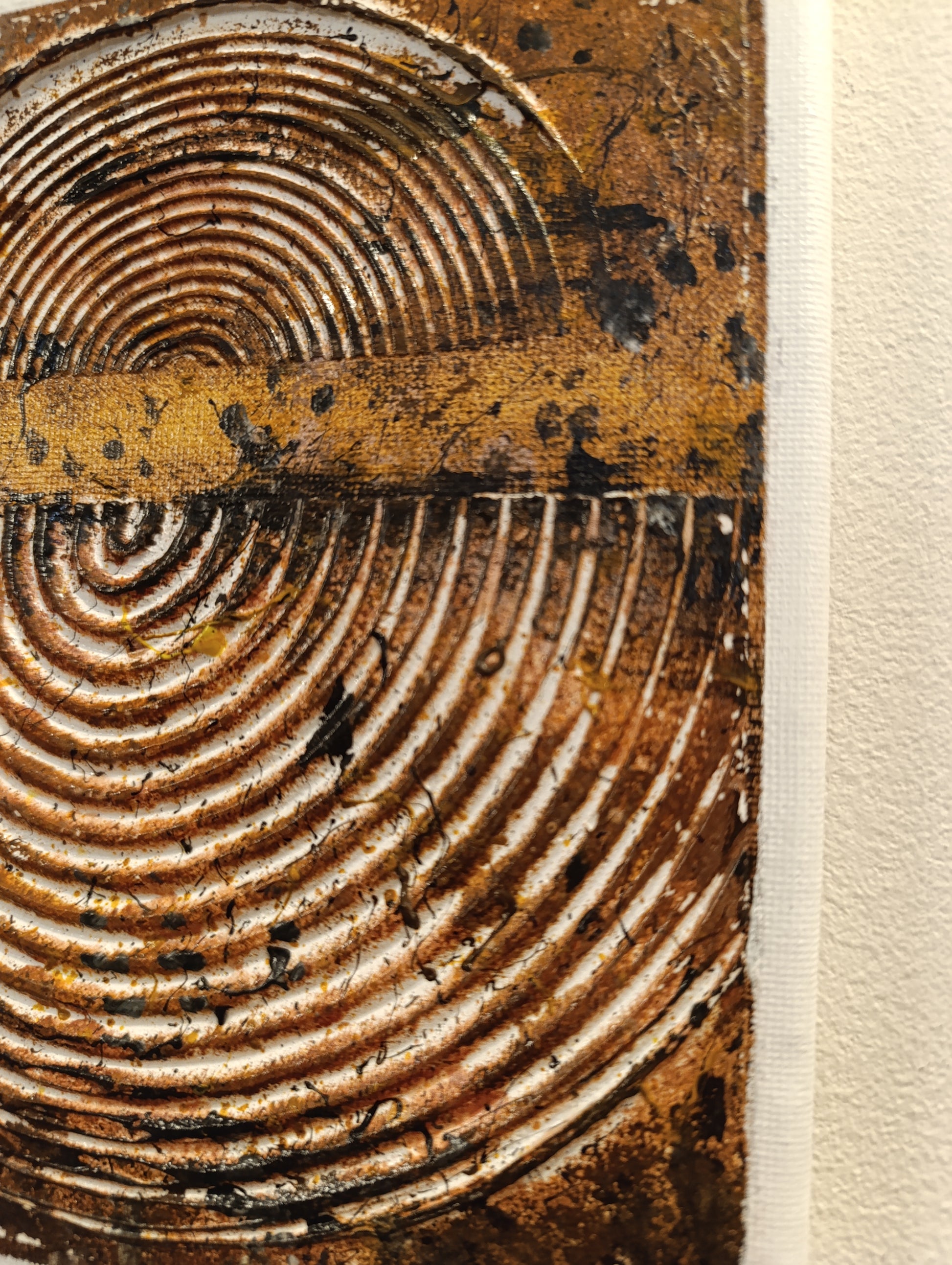 Omanyte è un’opera di 20x20 cm, intensa e misteriosa, che esplora texture fossili e tonalità terrose. Le forme concentriche, simili a gusci antichi o spirali evolutive, si intrecciano in una composizione densa e stratificata, evocando l’immagine di un fossile primordiale, simbolo profondo di ciclicità, tempo e origine.