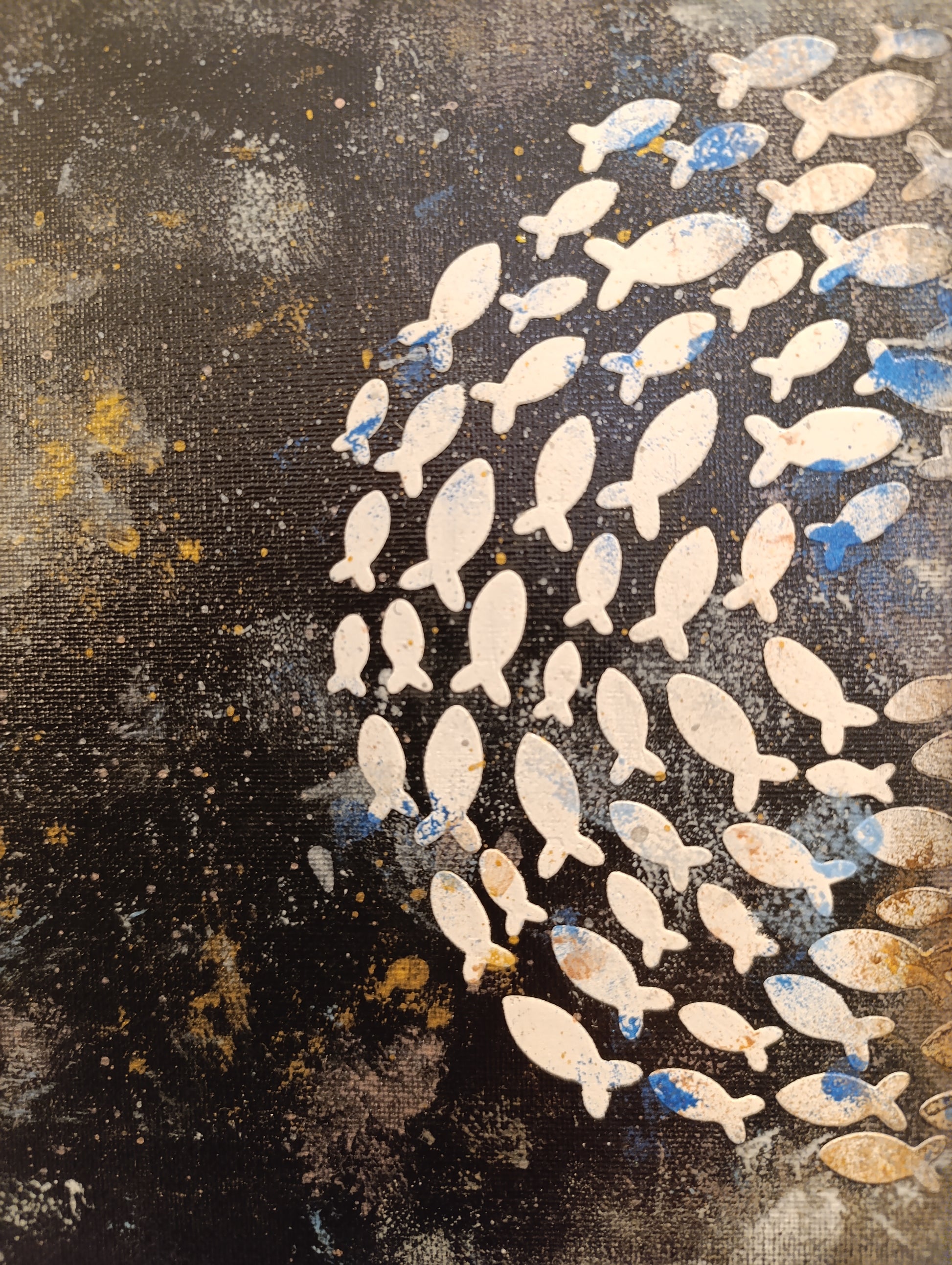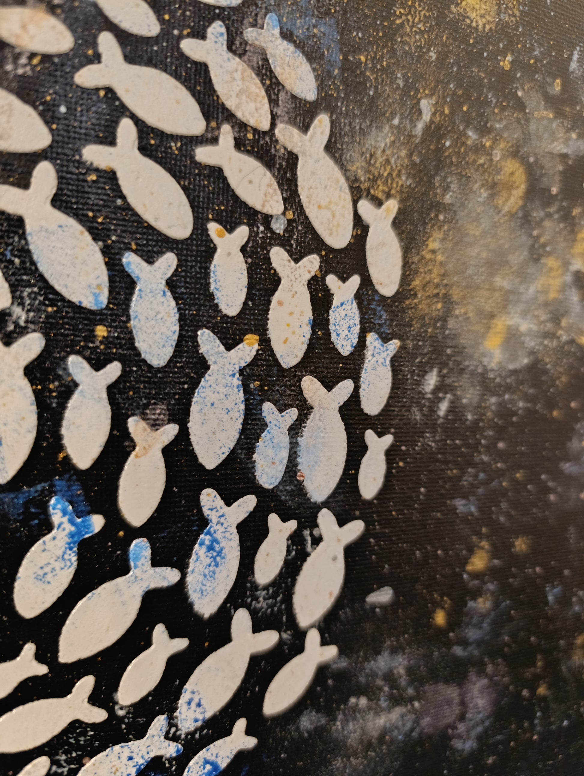 Porta il fascino del mare e la magia dell’arte materica nel tuo spazio con questo quadro moderno e suggestivo. "Giù" è una tela dipinta a mano che raffigura due sciami di pesci stilizzati, bianchi con accenti blu e oro, che si muovono armoniosamente su uno sfondo scuro e sfumato, ricco di texture e profondità.