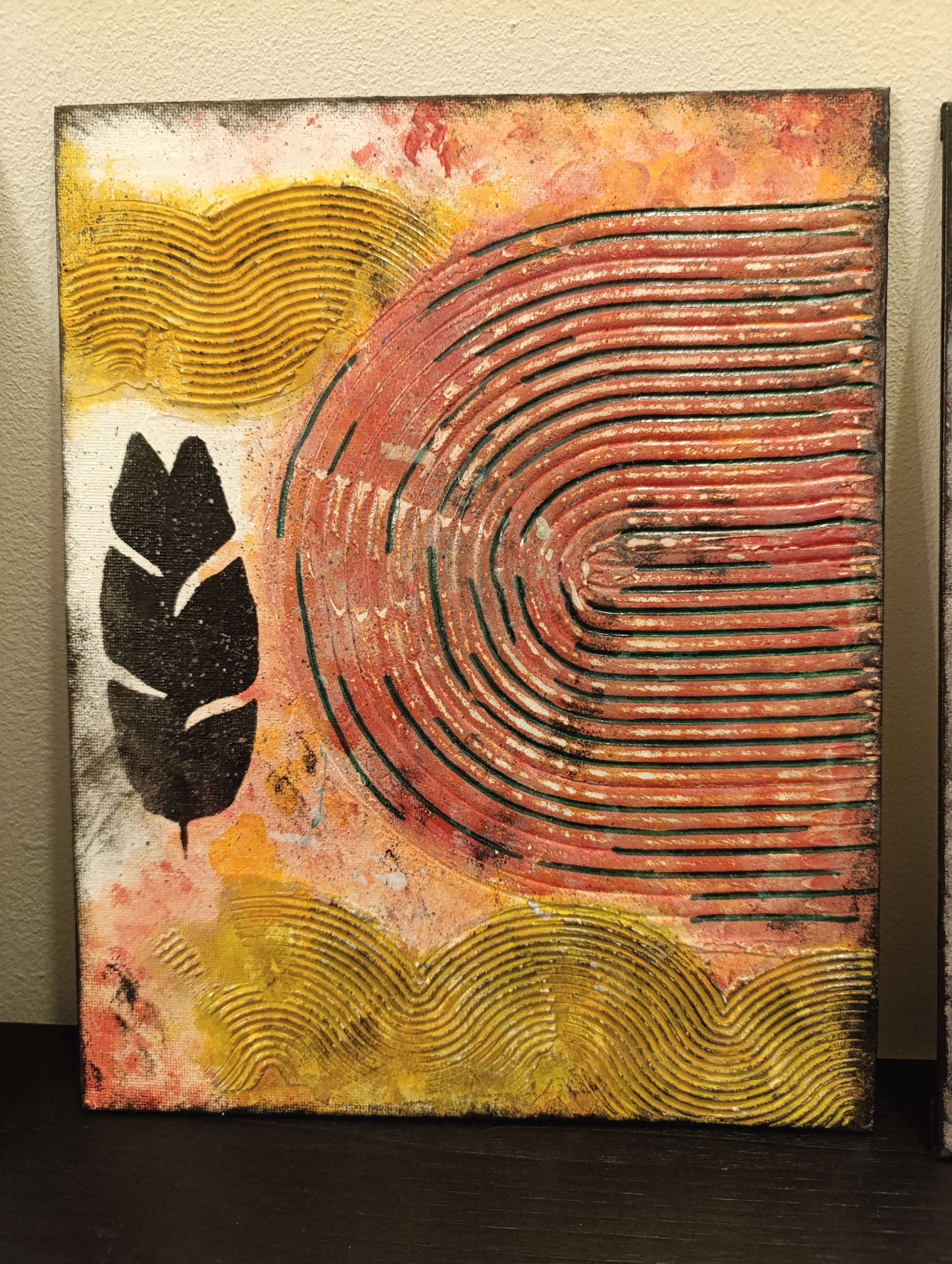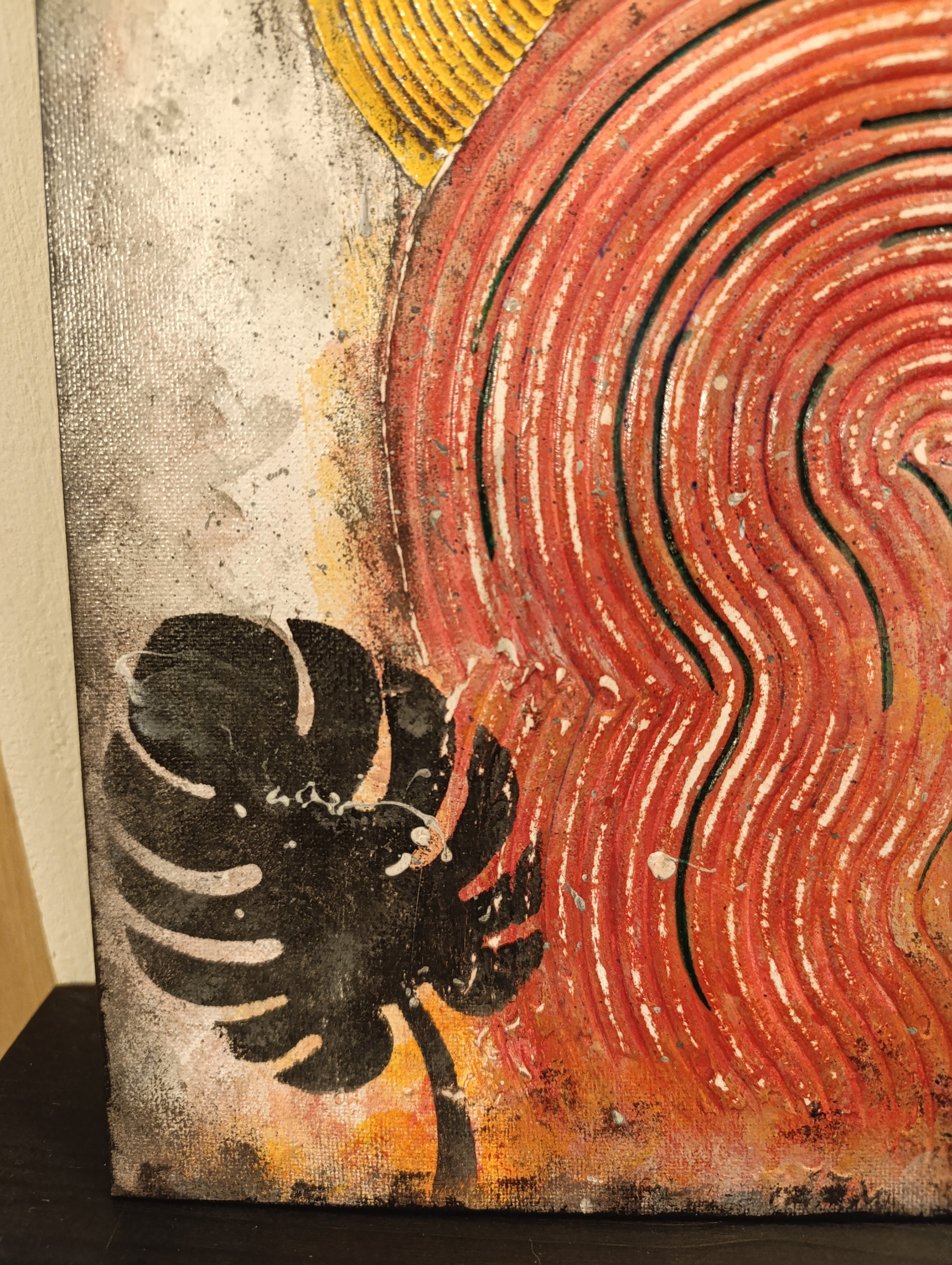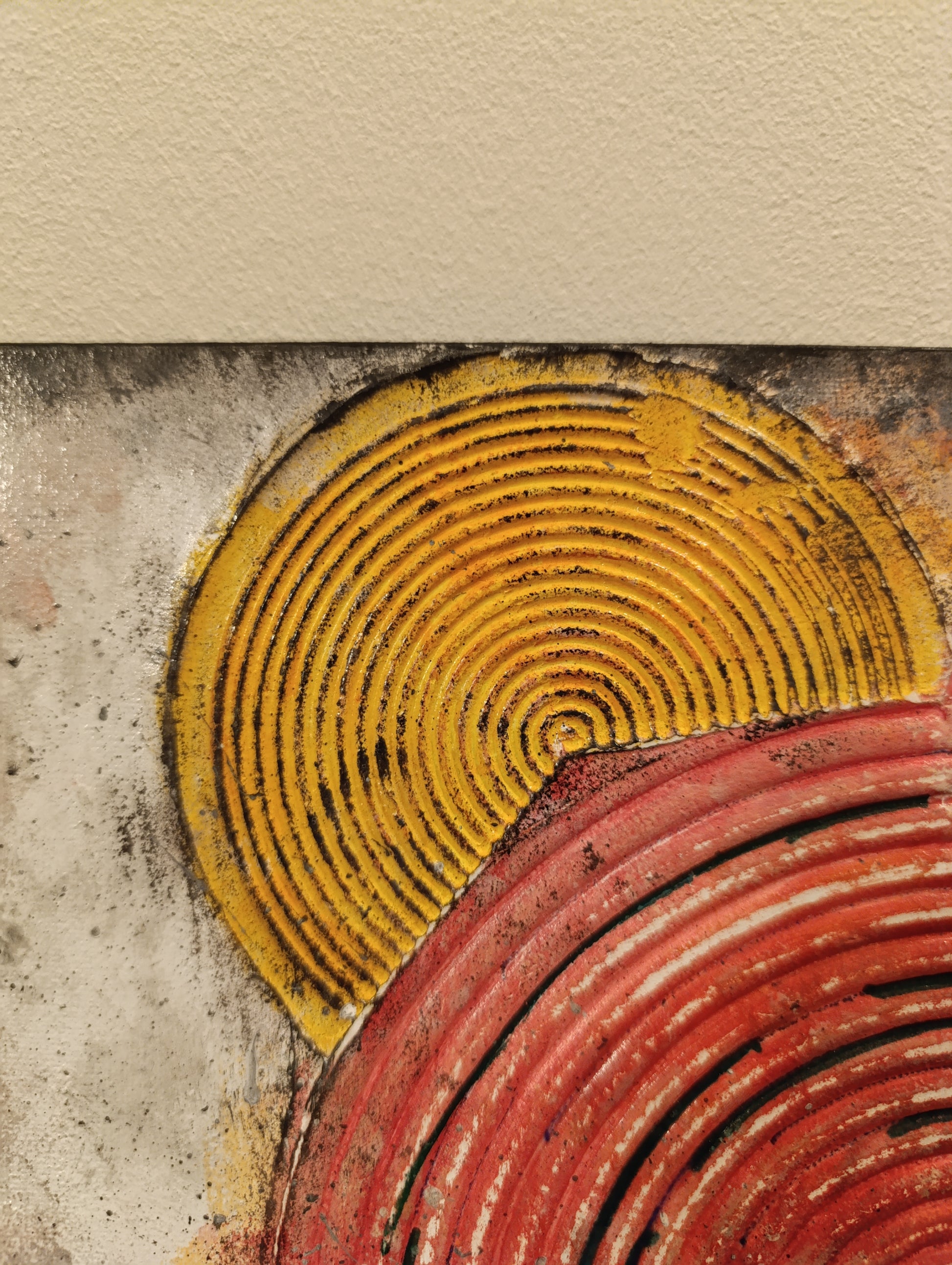 Le linee concentriche in rilievo, le texture spesse e le forme organiche intrecciate a simboli vegetali danno corpo a una tensione costante tra ciò che cresce spontaneamente e ciò che viene costruito. Il contrasto cromatico tra rosso, nero e giallo sole amplifica questa tensione, suggerendo energia, urgenza e resistenza.