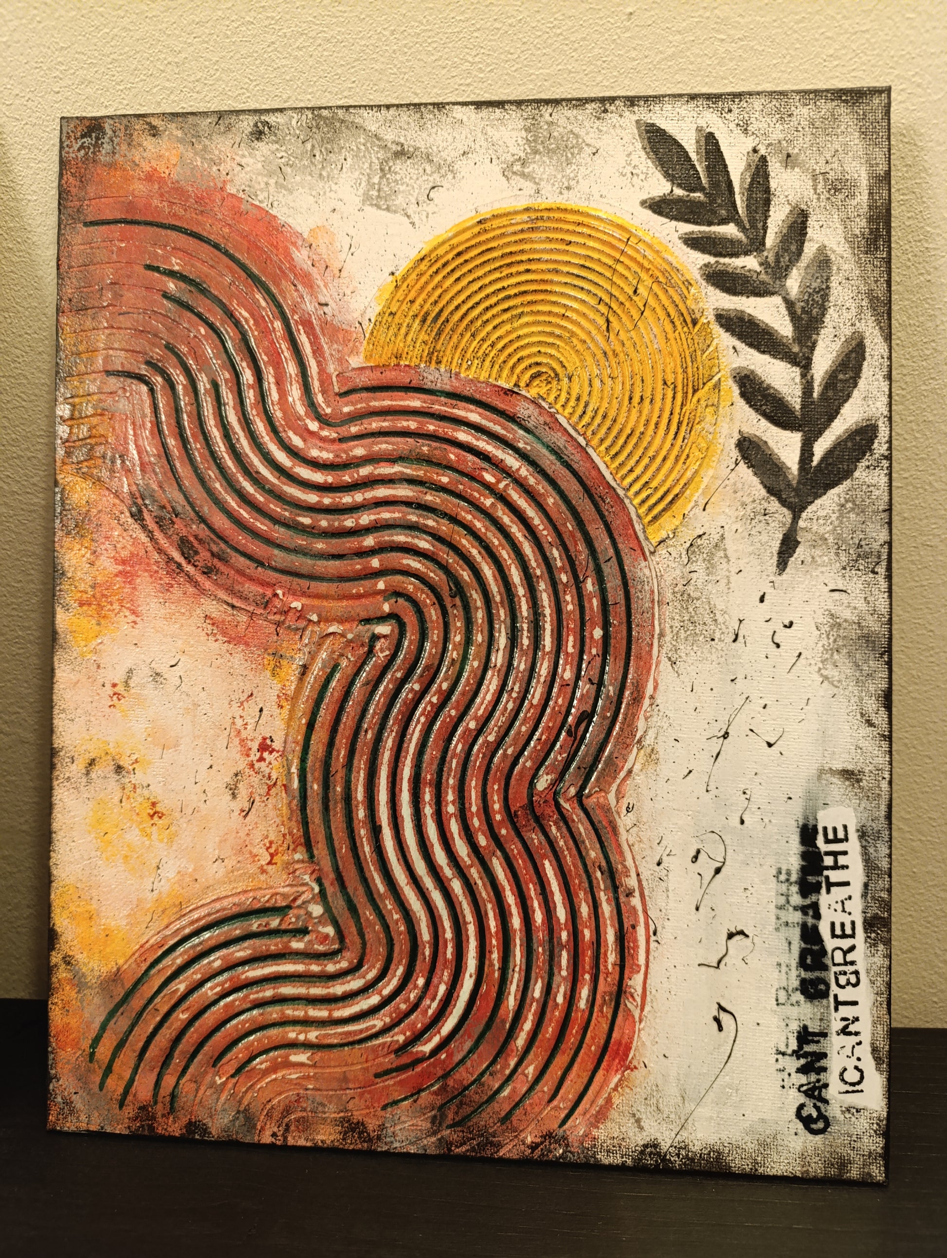 L’ultima tela del trittico presenta la scritta “CAN’T BREATHE”, un grido che non è solo sociale, ma anche ecologico: se la natura non respira più, non può farlo nemmeno l’uomo. È una denuncia visiva del sacrificio dell’ambiente sull’altare del progresso, che interroga il nostro ruolo in un sistema che consuma ciò da cui dipende la vita stessa.