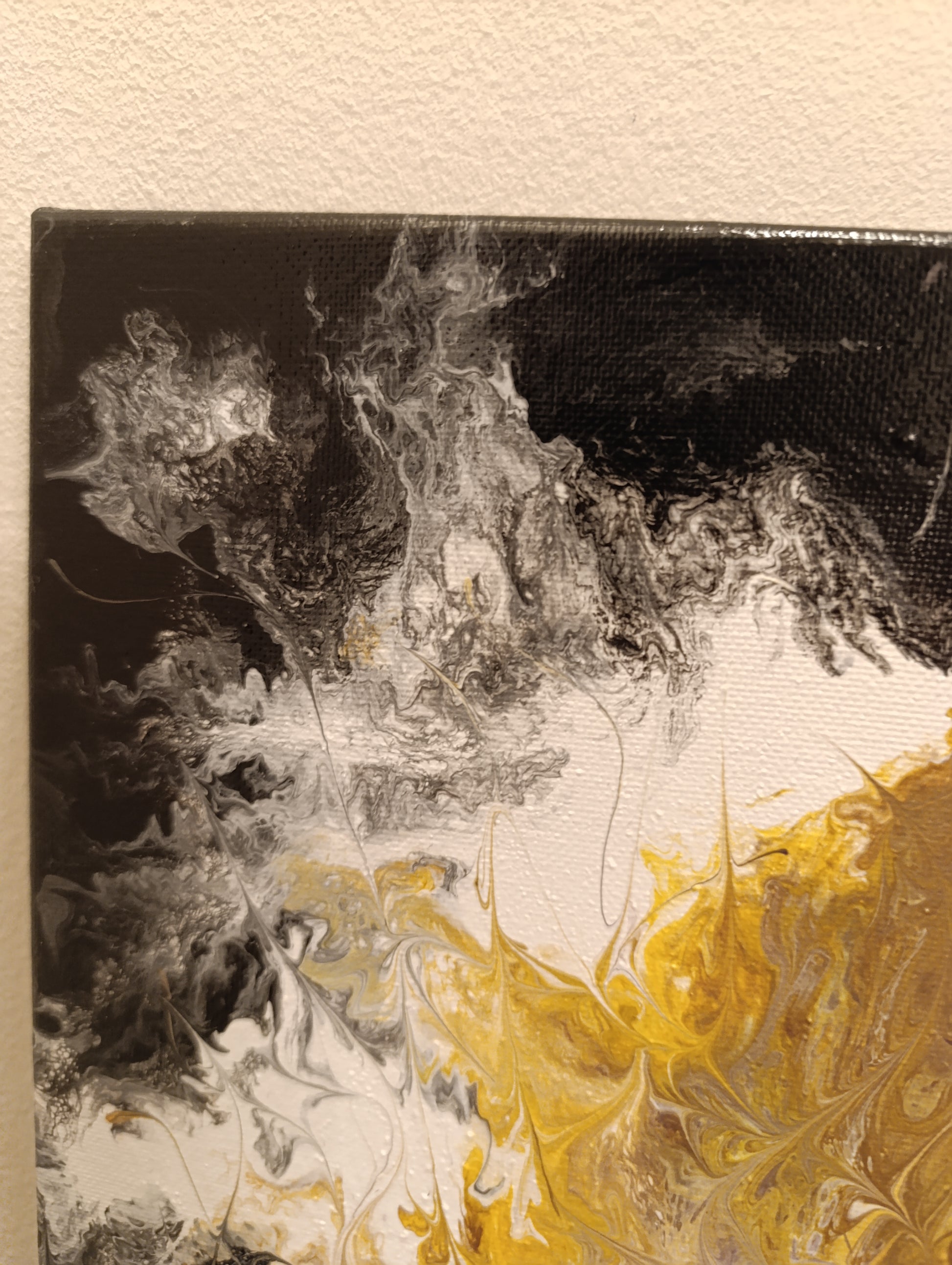 Schegge Impazzite è un’esplosione di energia, un vortice caotico di colori che si fondono e si scontrano in modo imprevedibile. Realizzato con la tecnica della fluid art, il dipinto 30x40 cm trasmette movimento e tensione, con venature violacee, giallo ocra, nero e tocchi di bianco che si rincorrono e si fondono su tutta la superficie.