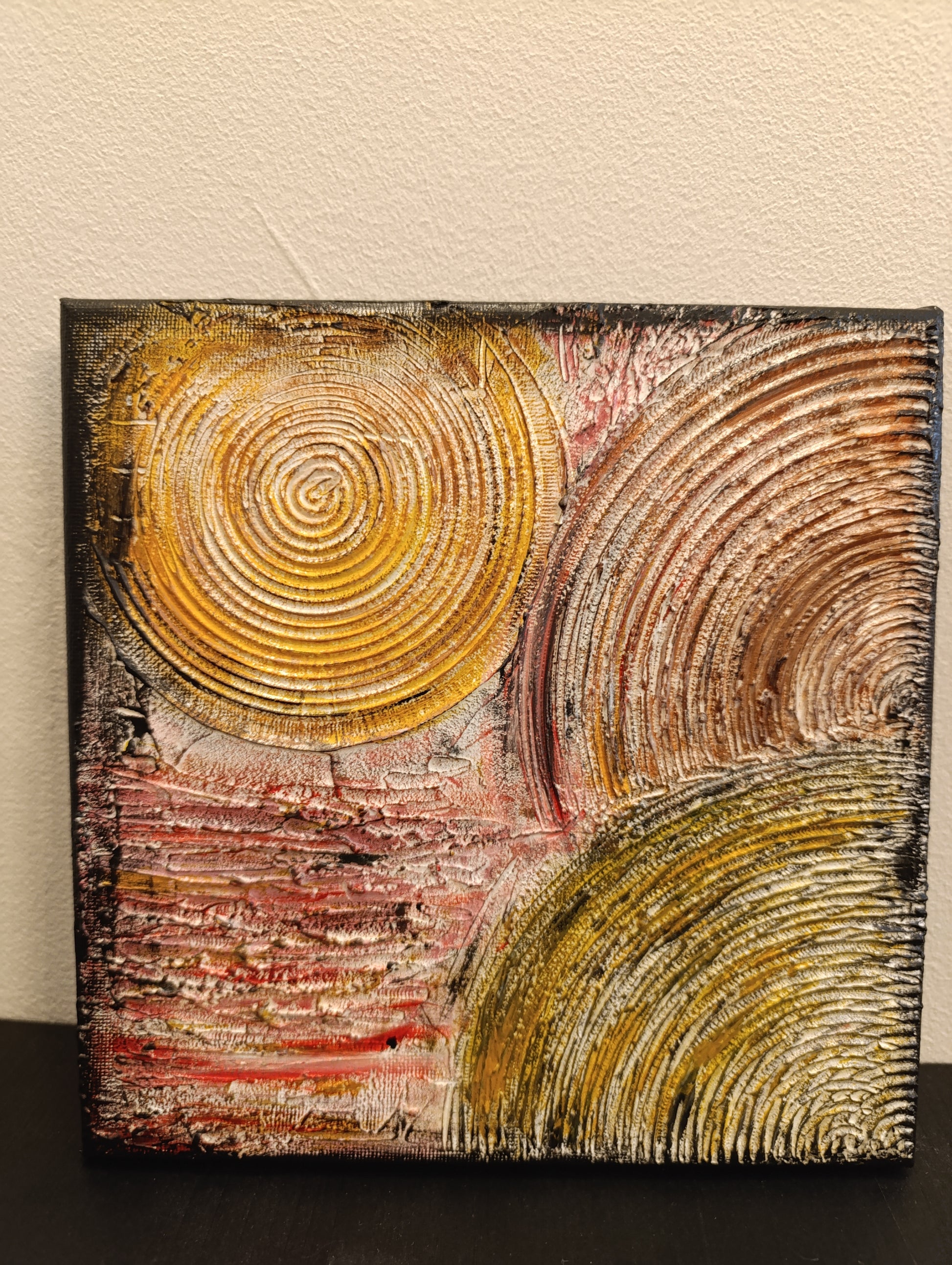 Sospensione temporale è un'opera 20x20 cm astratta che indaga la stratificazione del tempo e la ciclicità degli eventi. La superficie materica, densa e texturizzata, alterna cerchi concentrici a campi stratificati, creando un ritmo visivo che ricorda i sedimenti geologici o le onde del pensiero.