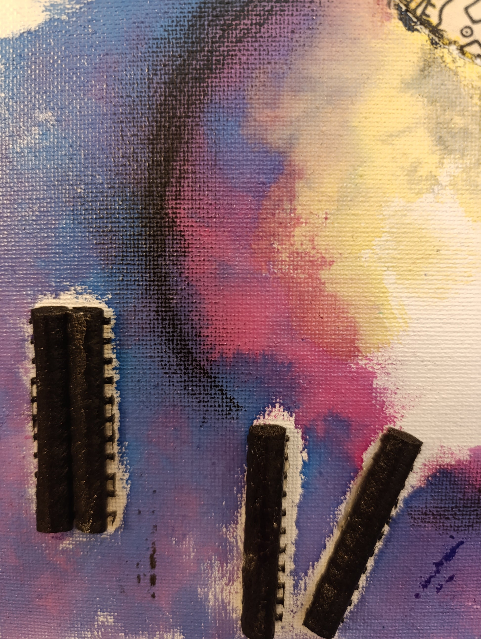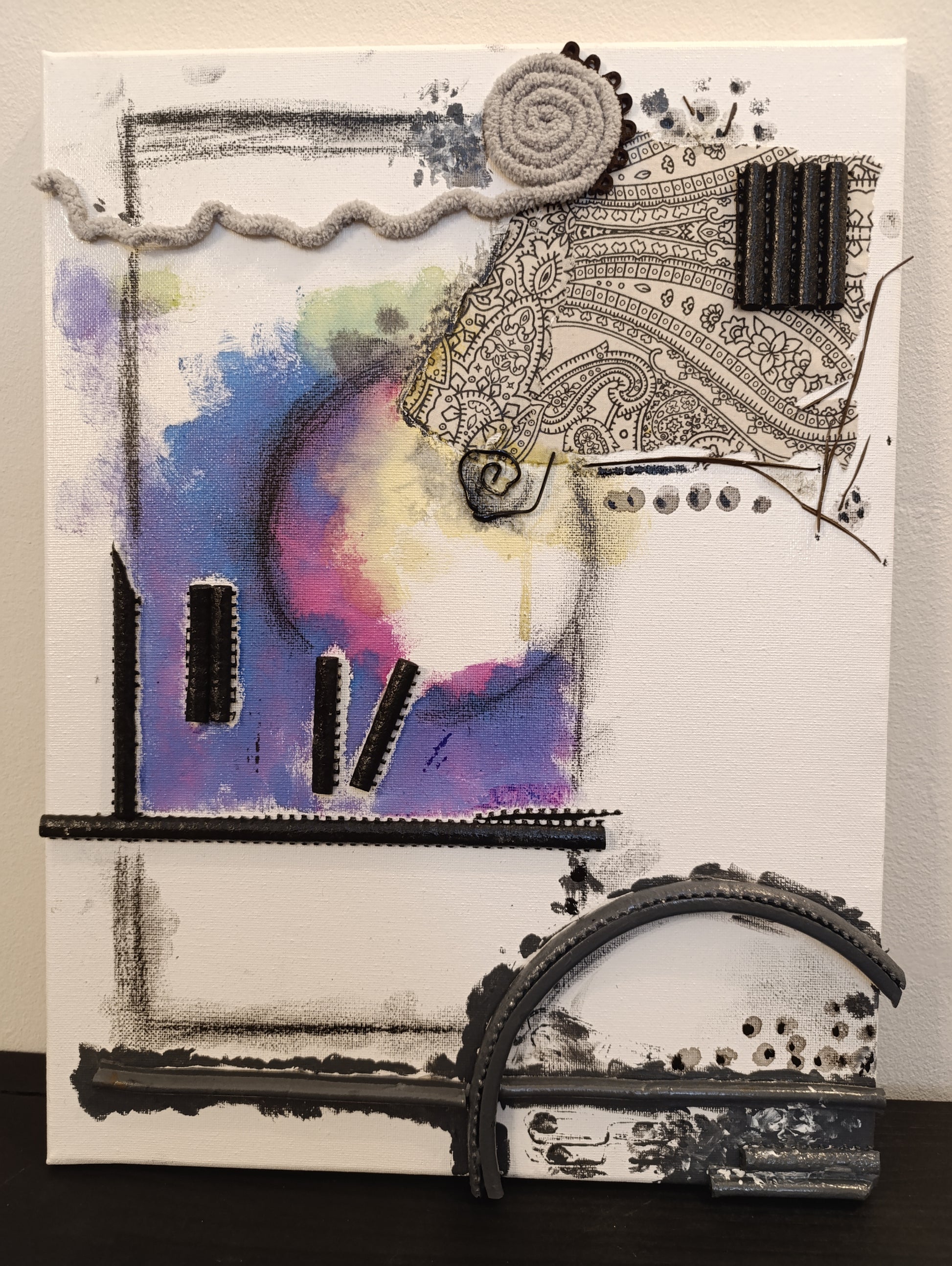 Scopri “Tempismo Perfetto”, un’opera d’arte contemporanea unica nel suo genere. Questa tela (40x30 cm) unisce pittura acrilica dai toni vibranti — blu, viola, rosa, giallo — a dettagli materici come tessuti, corde intrecciate, inserti in rilievo e frammenti geometrici. L’insieme crea un dialogo armonioso fra colore, texture e forme astratte, evocando l’idea di ritmo, movimento e connessioni nascoste.