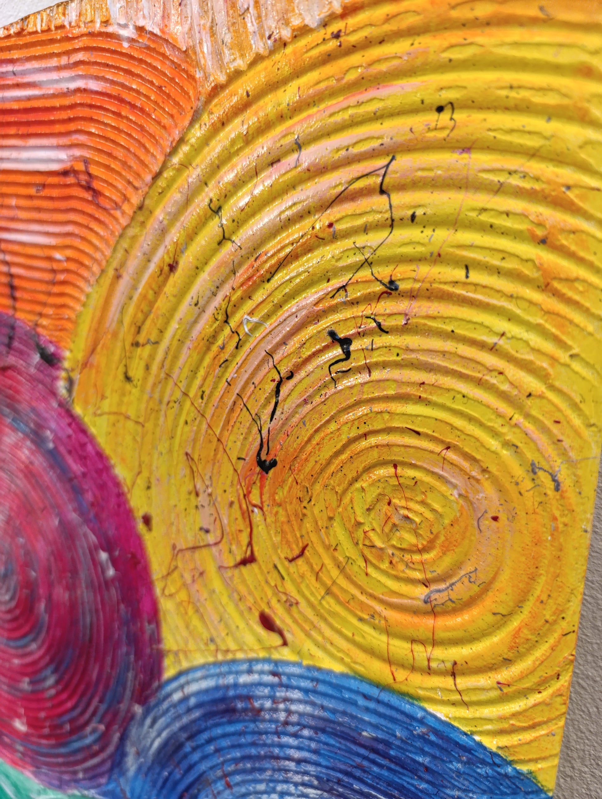 Yellow #16 è un'esplosione di luce e vitalità, espressa attraverso texture materiche e l’uso audace del colore. Le linee concentriche in rilievo e i contrasti cromatici evocano energia solare, gioia e rinascita.
